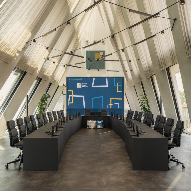 Il quarto piano ospita postazioni di lavoro condivise e sale riunioni, mentre il quinto piano di rappresentanza ospita la sala Consiglio, gli uffici di Presidenza e Direzione Generale e la sala eventi.